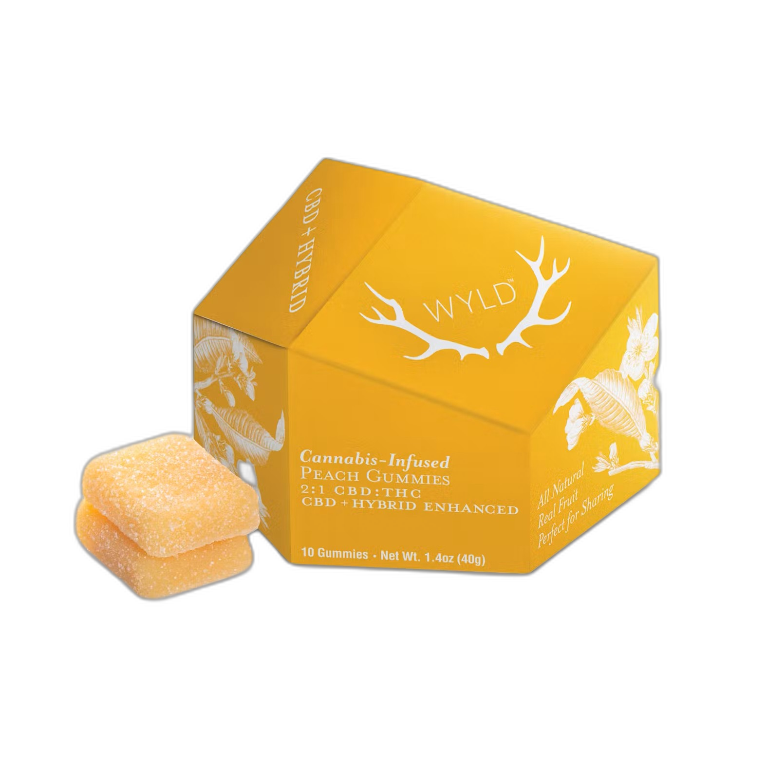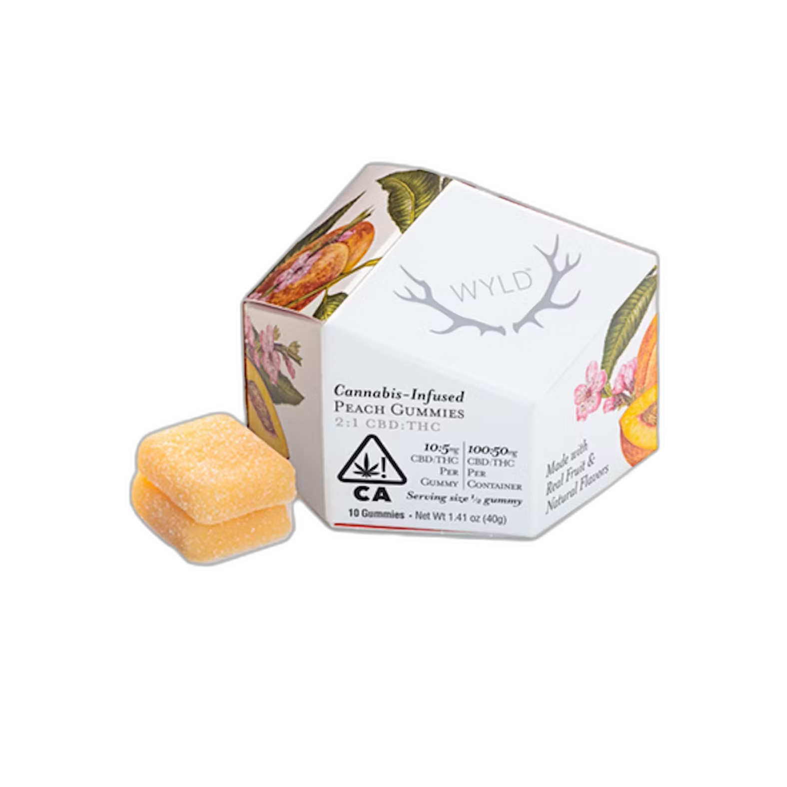 New to edibles? Wyld Peach gummies are made with a higher CBD than THC ratio, making them a great option for easing into edibles and finding your desi...[Read More]New to edibles? Wyld Peach gummies are made with a higher CBD than THC ratio, making them a great option for easing into edibles and finding your desired experience. They are made with real fruit and enhanced with a balanced terpene profile that may assist in creating a sense of ease and overall well-being. Ideal for when you need to take a break! Dosage: 100mg CBD:50mg THC per pkg, 10mg CBD:5mg THC per gummy Terpenes: Limonene, Linalool, Alpha Pinene, Beta Pinene [Less]
